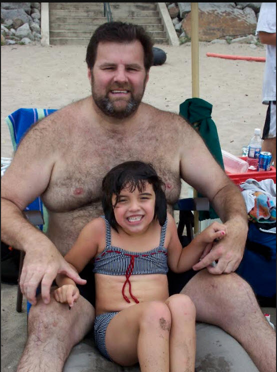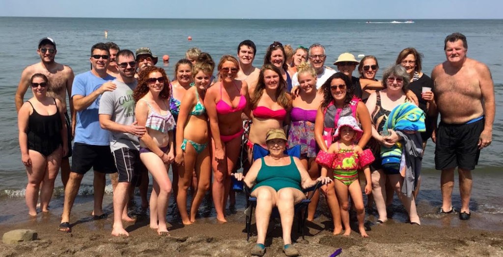Brian (in light blue t-shirt at left) enjoys beach time with a variety of siblings, daughters, cousins, nieces, nephews, and (seated in front), our matriarch Aunt Eileen (Koenig). Photo is from approximately 2014.
